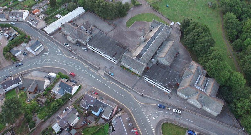 There is a high stone wall boundary to the south on Southwick Road to keep the children secure and on-campus, to the north east as the site adjacent Barrhill road bridge springs across Kirkgunzeon Lane river there is a significant retaining wall and a line of mature trees.